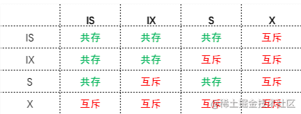 意向共享锁(IS):在准备给表数据添加一个S锁时,需要先获得该表的IS锁。