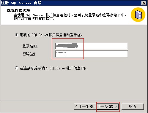 3)接下来选择管理员给我分配的SQL Server登录信息,再点击下一步。然后输入用户名密码,还是点击下一步,最后点击完成。