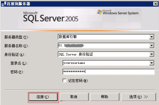 2)在服务器名称上输入IP地址,身份验证选择SQL Server身份验证,然后输入数据库用户名和密码,点击连接即可。后续步骤和SQLServer2000的类似。