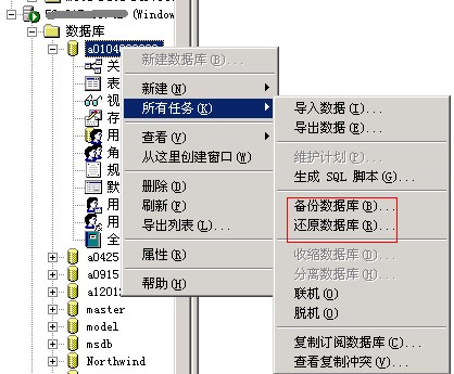 6)接下来,右键点击数据库名,选择所有任务,再点击备份数据库或还原数据库。关于备份和还原的具体操作办法,请看下面独立服务器中的说明。