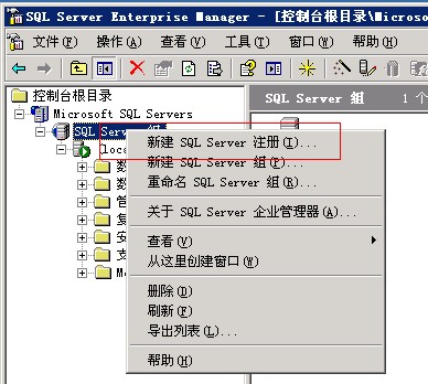 1)这种方法要求我们自己电脑上安装了微软的SQLServer软件。打开开始菜单->程序->Microsoft SQL Server->企业管理器,依次展开Microsoft SQL Servers->SQL Server 组->(local),右键点击SQL Server 组,再点击新建SQL Server注册。