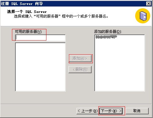 2)在注册SQL Server向导中,点击下一步。然后在可用的服务器下输入数据库IP地址,点击添加,再点击下一步。