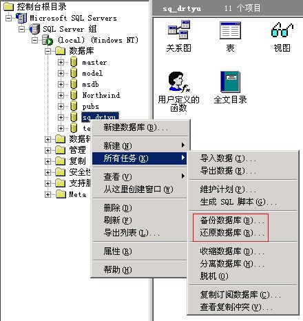 1)打开开始菜单->程序->Microsoft SQL Server->企业管理器,依次展开Microsoft SQL Servers->SQL Server 组->(local)->数据库,右键点击数据库名,选择所有任务,再点击还原数据库。
