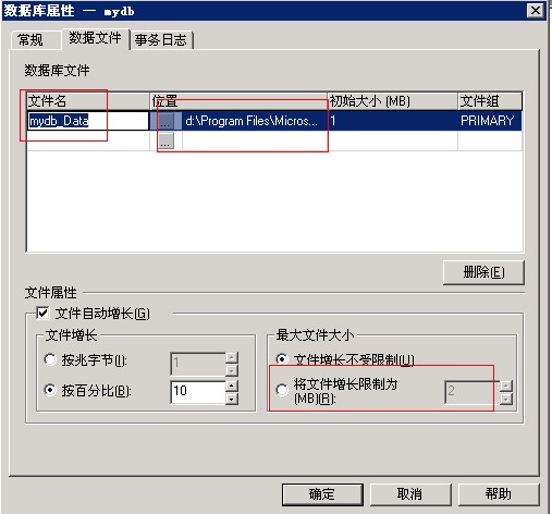 2)数据库属性对话框中,在常规选项卡中输入数据库名,然后在数据文件和日志文件中指定名称和保存位置(建议把数据库放在D盘),还可以指定数据库的最大限额。