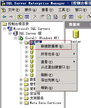 1)打开开始菜单->程序->Microsoft SQL Server->企业管理器,依次展开Microsoft SQL Servers->SQL Server 组->(local)->数据库,右键点击数据库,再点击新建数据库。