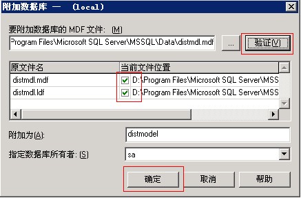 2)然后输入mdf文件的具体路径,点击验证,看到下面出现两个绿色勾的时候说明文件完整,然后填上数据库名(附加为这项),再点击确定,就附加成功了。