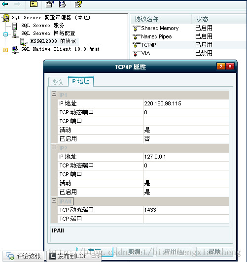 将IP ALL的TCP动态端口(默认1163)改为1433,不改也行,因为大部分人的习惯是用默认的1433,在IP2已启用选择——是,确定。