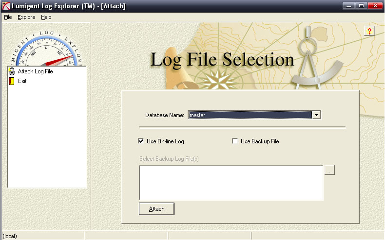 在这里选择要恢复数据的数据库,选择Use On-line Log(如果你又备份文件的话就不需要用这个工具了,直接用SQL搞定了)。然后点Attach,进入下面的界面: