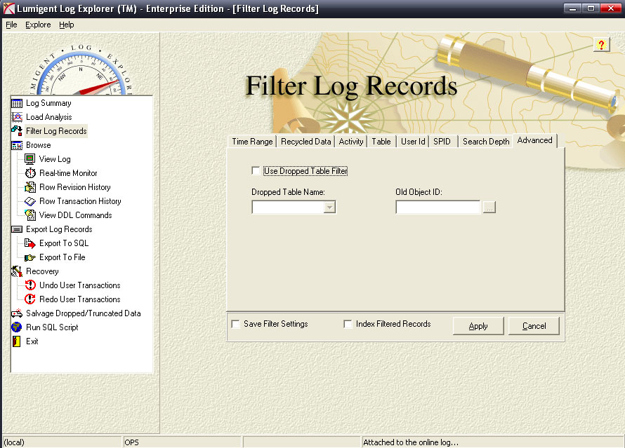 过滤日志之后,就该到导出数据这一步了,这个工具提供了两种方式,第一是导出到XML或HTML文件中(对应左边菜单中的Export To File),第二是直接在数据库中建新表,然后将数据导入(Export To SQL)。