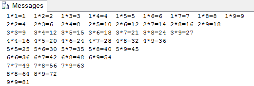 SET @S=@S+CAST(@I AS CHAR())+’*’+CAST(@J AS CHAR())+’=’+CAST((@I*@J)AS CHAR())