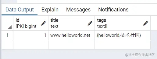 可以看到,已经有了一条数据了,tags 数组里面有3个元素,分别是 helloworld , 技术 , 社区