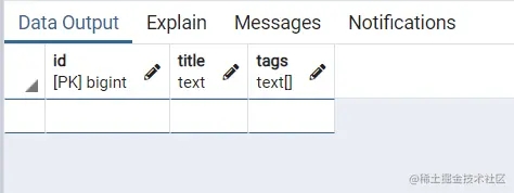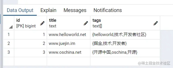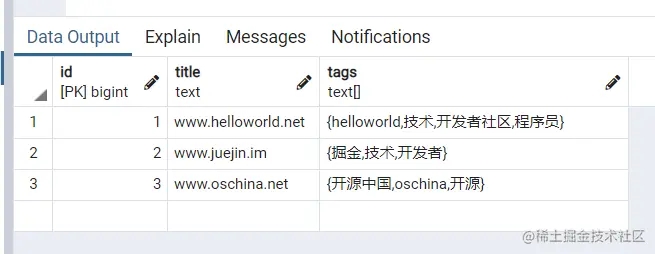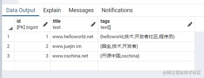 上面这个博客标签需求,需要 3 张表,我们知道,PostgreSQL 的列的类型是支持数组类型的