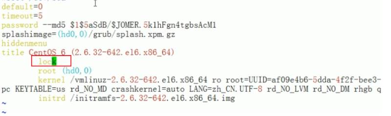 [root@localhost ~]# vim /boot/grub/grub.conf # 内容 default=0 timeout=5 # password选项放在整体设置处。 password --md5 $1$Y84LB1 $8tMY2PibScmu0Cc8z8U35/ splashimage=(hd 0,0)/grub/splash.xpm.gz