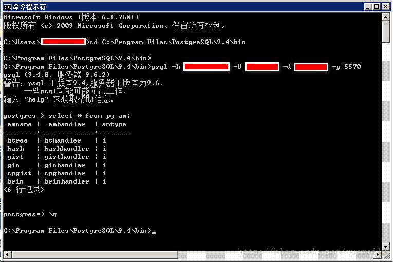 方法:进入postgreSQL的客户端安装目录(我的安装目录:C:\Program Files\PostgreSQL\9.4\bin),执行psql命令,其中\q表示退出数据库