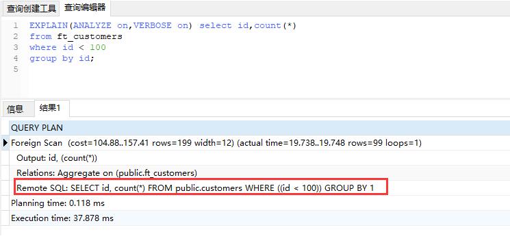 mydb=# EXPLAIN(ANALYZE on,VERBOSE on) select id,count(*) from ft_customers where id < 100 group by id;