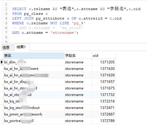 SELECT c.relname AS “表名”,a.attname AS “字段名”,c.oid