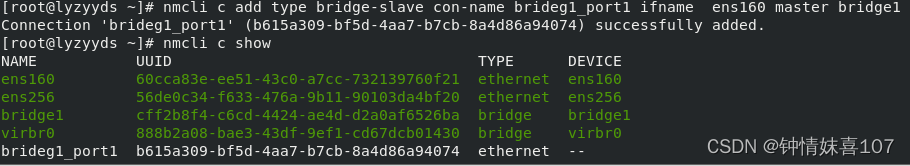 [root@lyzyyds ~]# nmcli c add type bridge-slave con-name brideg1_port1 ifname ens160 master bridge1