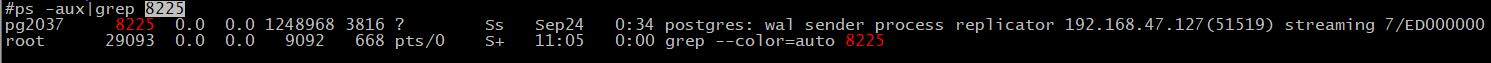上面说到pid代表负责流连接的wal_sender进程的进程ID,我们在机器上通过ps命令查看该进程的状态: