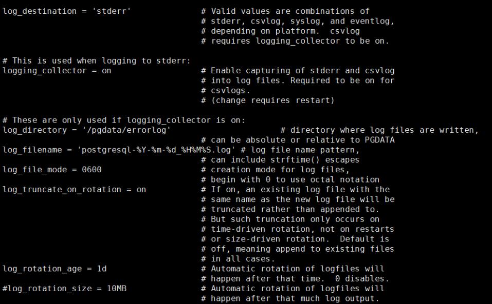 log_destination:建议设置为csvlog,以便将日志链接到PostgreSQL中查看.参看Error Reporting and Logging 19.8.4. Using CSV-Format Log Output