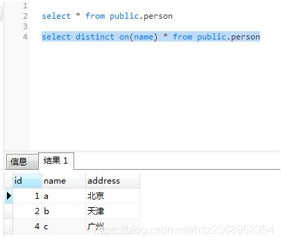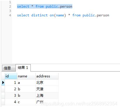 补充:PostgreSQL按照某一字段去重,并显示其他字段信息