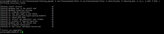 #切换数据库用户 su -postgres #检查是否可以升级,一连串的ok即表示可以执行数据库文件的升级 /usr/lib/postgresql/13/bin/pg_upgrade -b /usr/lib/postgresql/10/bin -B /usr/lib/postgresql/13/bin -d /data/old_data -D /data/new_data -U dbuser -p 5433 -P 5434 -c