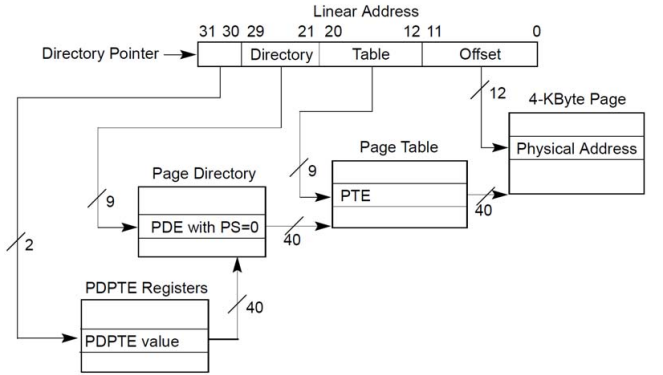 10+10+12,分别索引1级页表号,2级页表项,记录物理基地址的偏移地址。使用PAE机制之后32bit系统支持最大的内存是64GB(地址是32+4=36位)。