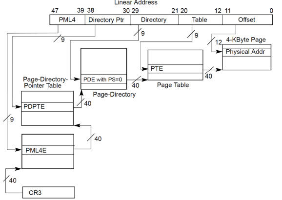 线性地址为48bit,最大物理地址为52bit,实际物理内存地址总线宽度是40bit,也就是支持1TB物理内存x86_64有四级页表,原理同x86系统,也是一层层的寻址CR3寄存器保存最高层一级表的起始物理地址,因此寻址首先就是要获取到CR3寄存器中的值每个PTE表项的大小是8个字节也就是64bit