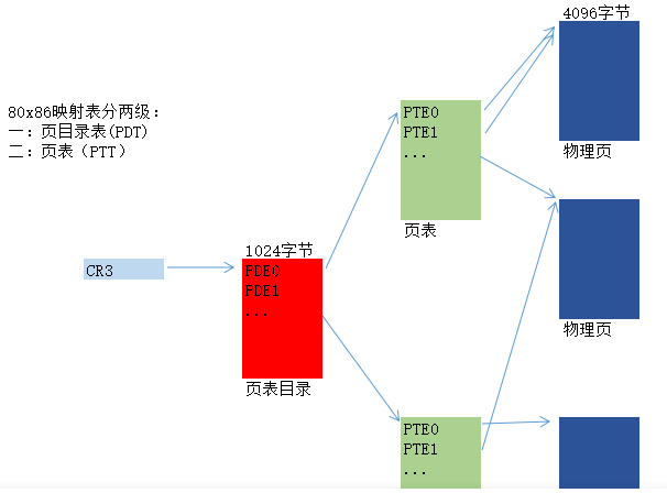 二级页表选址方式,一个内存页4KB大小,一级页目录表1024项,二级页表1024项,一个页表项4字节。一级页目录表项全部分配,二级页表在需要的时候创建。(局部性原理)。