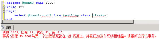 (由于在默认隔离级别下(读提交)读申请S锁只是瞬间过程,读完立即释放,不会等待事务完成),所以在并发,执行频率不高的情形下不易出现.但我们模拟的高频情况使得S锁获得频率非常高,此时就出现了仅仅两个会话,一个读,一个写就造成了死锁现象.