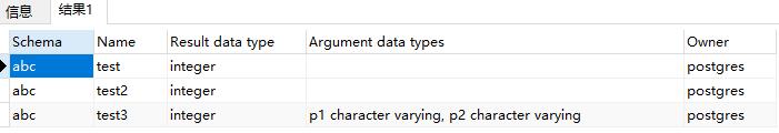 当前显示模式“abc”有2个无参函数和1个带参函数,拥有者都是postgres超级用户。