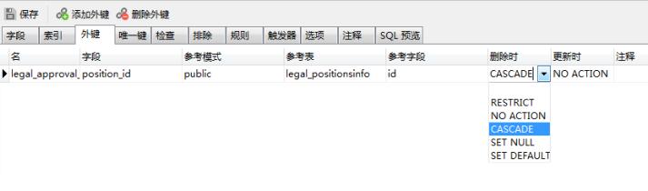 最近的一个项目中,所涉及的数据库表之间有设置级联关系,即表legal_positionsinfo中的id是表legal_approval的外键。