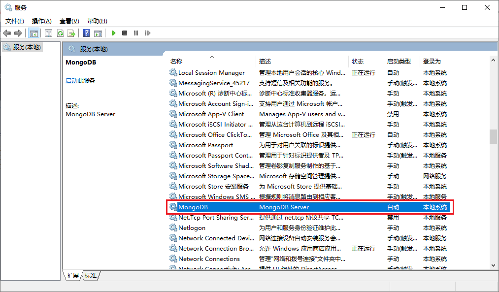我们打开服务,MongoDB已安装为WIndwos服务,并自动开启: