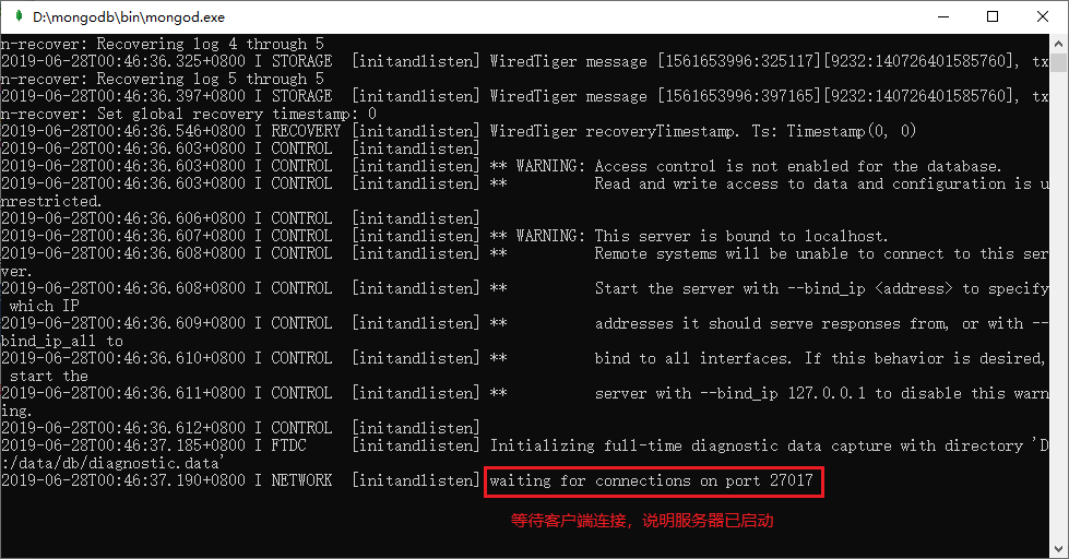 2019-06-27T23:50:26.428+0800 I CONTROL [main] Service can be started from the command line with ‘net start MongoDB’