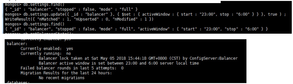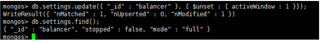 db.settings.update({ _id : “balancer” }, { $set : { activeWindow : { start : “23:00”, stop : “6:00” } } }, true ) ;