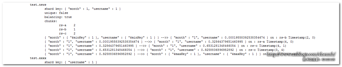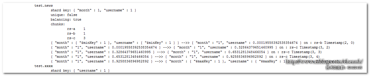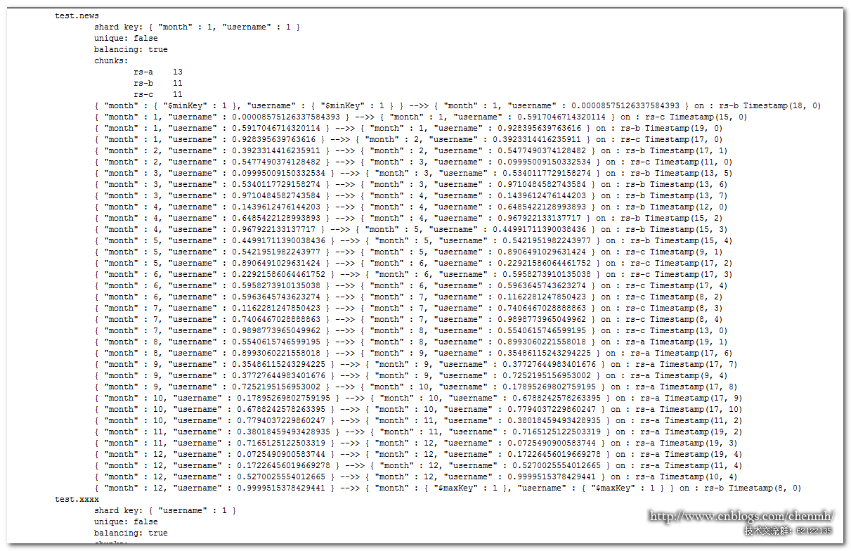 新数据往一直往最末尾的分片(rs-a)上插,因为这个时候”month”:2在最大的分片上。 { "month" : "1", "username" : 0.9258836896982892 } -->> { "month" : { "$maxKey" : 1 }, "username" : { "$maxKey" : 1 } } on : rs-a Timestamp(3, 1)