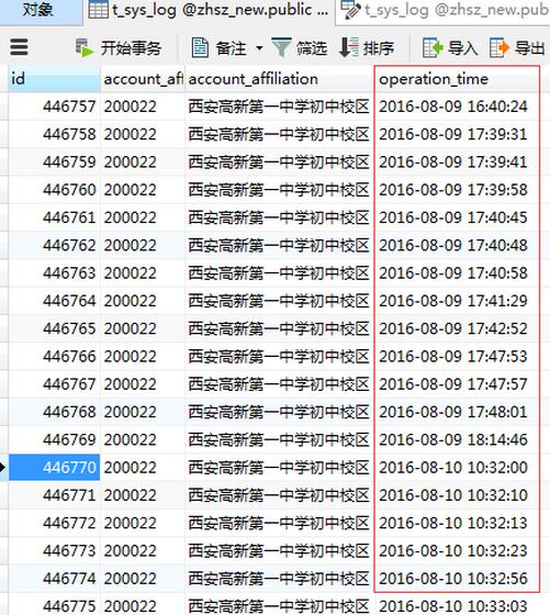 (1,’200023′, ‘西安高新第一中学初中校区’, ‘2016-9-12 18:49:26.004′, ’01’, ‘xx’, ‘zhsz_t’, ‘test!’, ‘127.0.0.1’);