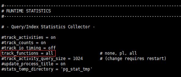 到这里就全部创建完成了,最后测试一下看看结果。为了确认我们的触发器的确触发了,我们打开存储过程的统计开关,在postgresql.conf中,找到track_functions,改成all:
