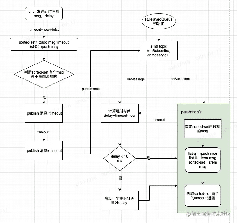 消费端收到订阅消息后会查询zset中的过期消息,并放入阻塞队列供消费端take消息,并且获取zset第一个消息,启动一个延时任务,到期后继续从zset中获取过期消息如此循环。