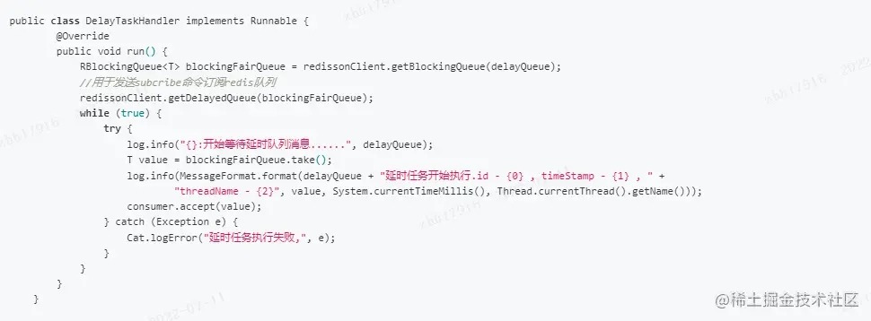 log.info(“delay queue {},延时任务开始执行,value – {} , timeStamp – {} , threadName – {}”, delayQueue, value, System.currentTimeMillis(), Thread.currentThread().getName());