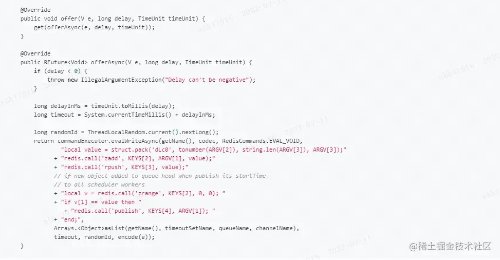 可以看到这里创建了一个QueueTransferTask,实现了pushTaskAsync()方法,具体内容是一个lua脚本,首先执行zrangebyscore 获取过期的前一百条数据,循环调用rpush,lrem,zrem,注意这里rpush的队列为我们指定的延时队列,也就是consumer端take的队列。至此明白了消费端的消息是方法pushTaskAsync()执行后放入的。那么什么时候执行这个方法呢。