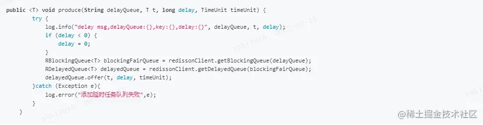 log.info(“delay msg,delayQueue:{},key:{},delay:{}”, delayQueue, t, delay);