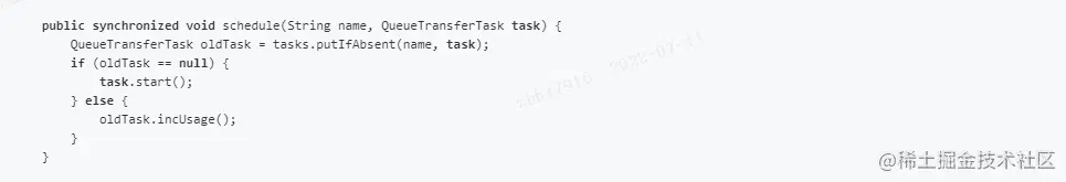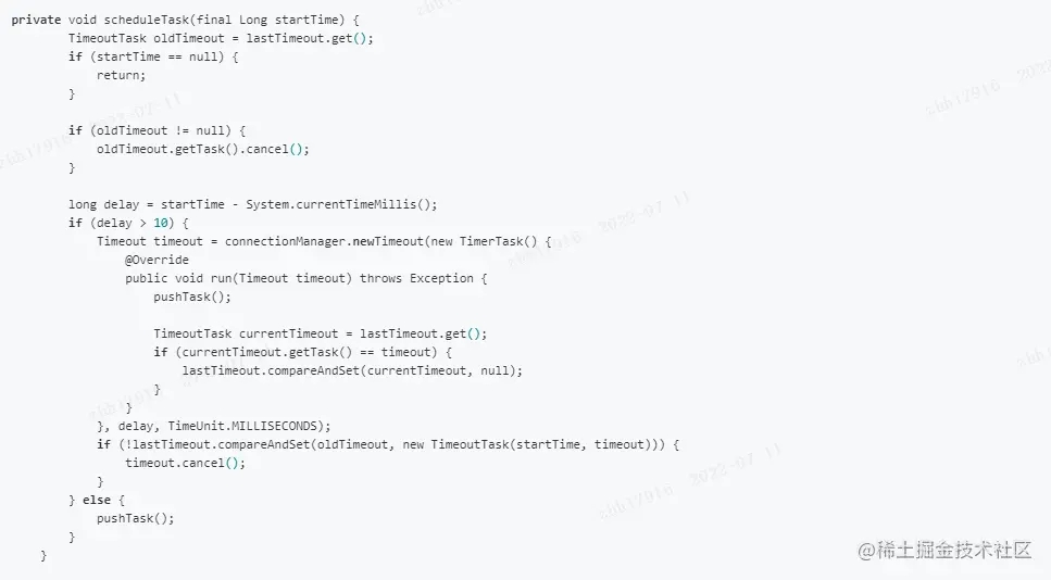 这里可以看到一个熟悉的方法pushTaskAsync(),也就是前边的一段lua脚本,用于将过期的消息放入阻塞队列,并返回排在第一个的消息执行scheduleTask()