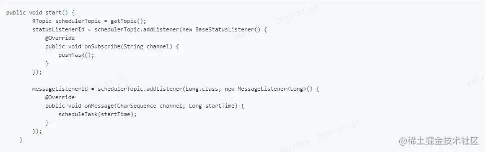 这里可以看到添加了两个listener,onSubcribe,onMessage,当订阅到消息时执行onSubcribe中的pushTash,当redis有新的消息通知,就会触发scheduleTask(…)方法,startTime为上述中publish通知的元素过期时间