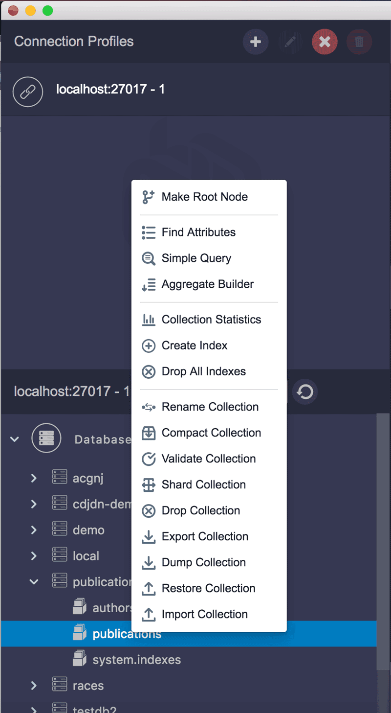连接管理器维护多个数据库连接的配置信息(Profile)。在连接管理器窗口的下半部分,显示了包含每个活跃数据库连接及相应集合(Collection)的列表。点击鼠标右键,就会弹出一系列菜单选项,包括构建查询、执行CRUD操作、索引和导入导出数据(如下图左侧所示)。连接配置信息编辑器用于创建新的数据库连接,它支持所有形式的数据库连接语法(如下图右侧所示)。