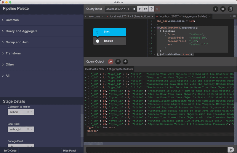 聚合构建器的功能类似于查询构建器,支持构建需要 aggregate 聚合函数的更复杂查询。在下面的例子中, publications 集合(Collection)使用 $lookup 操作符执行与 authors 集合的做内连接运算。