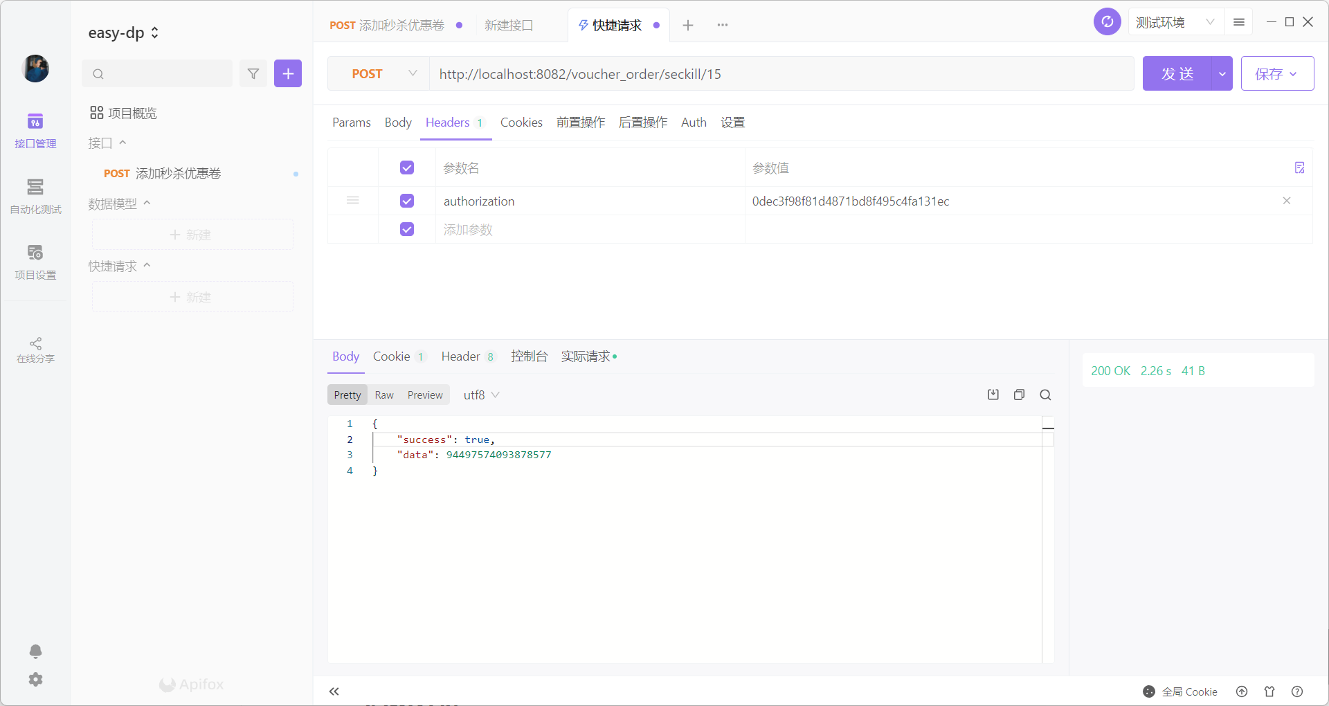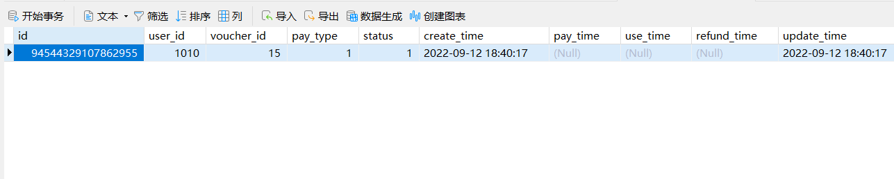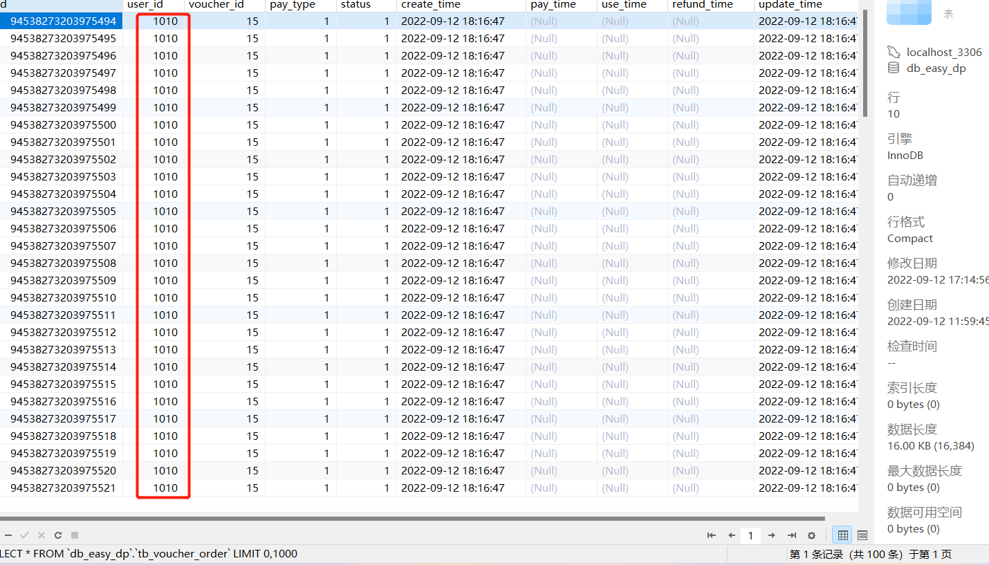 id都一样,这可不行啊,我们真实场景下,发放优惠卷不会让一个用户去抢购所有的订单秒杀优惠卷,这样商家就太亏了,全让黄牛给抢走了,这可不行,我们需要限制用户的抢购数量。