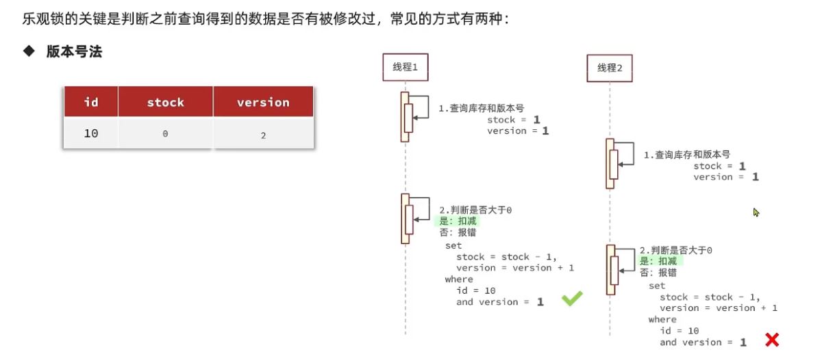 在操作时,对版本号进行+1 操作,然后要求version 如果是1 的情况下,才能操作,那么第一个线程在操作后,数据库中的version变成了2,但是他自己满足version=1 ,所以没有问题,此时线程2执行,线程2 最后也需要加上条件version =1 ,但是现在由于线程1已经操作过了,所以线程2,操作时就不满足version=1 的条件了,所以线程2无法执行成功