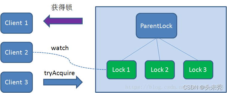 这样一来,Client1得到了锁,Client2监听了Lock1,Client3监听了Lock2。这恰恰形成了一个等待队列,很像是Java当中ReentrantLock(可重入锁)所依赖的AQS(AbstractQueuedSynchronizer)。