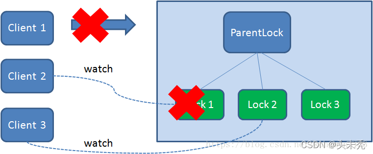 同理,如果Client2也因为任务完成或者节点崩溃而删除了节点Lock2,那么Client3就会接到通知。