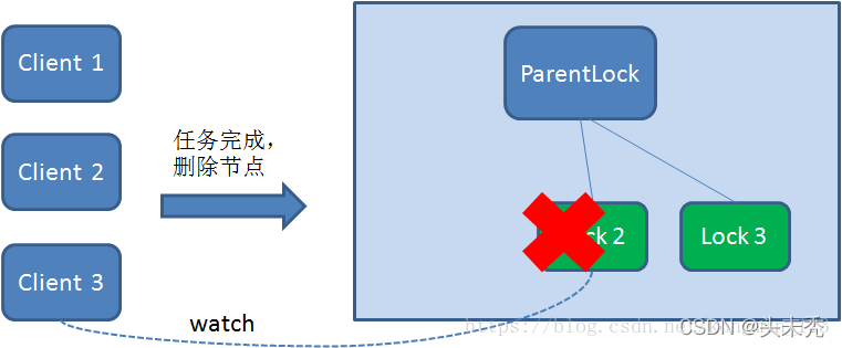 当任务完成时,Client1会显示调用删除节点Lock1的指令。